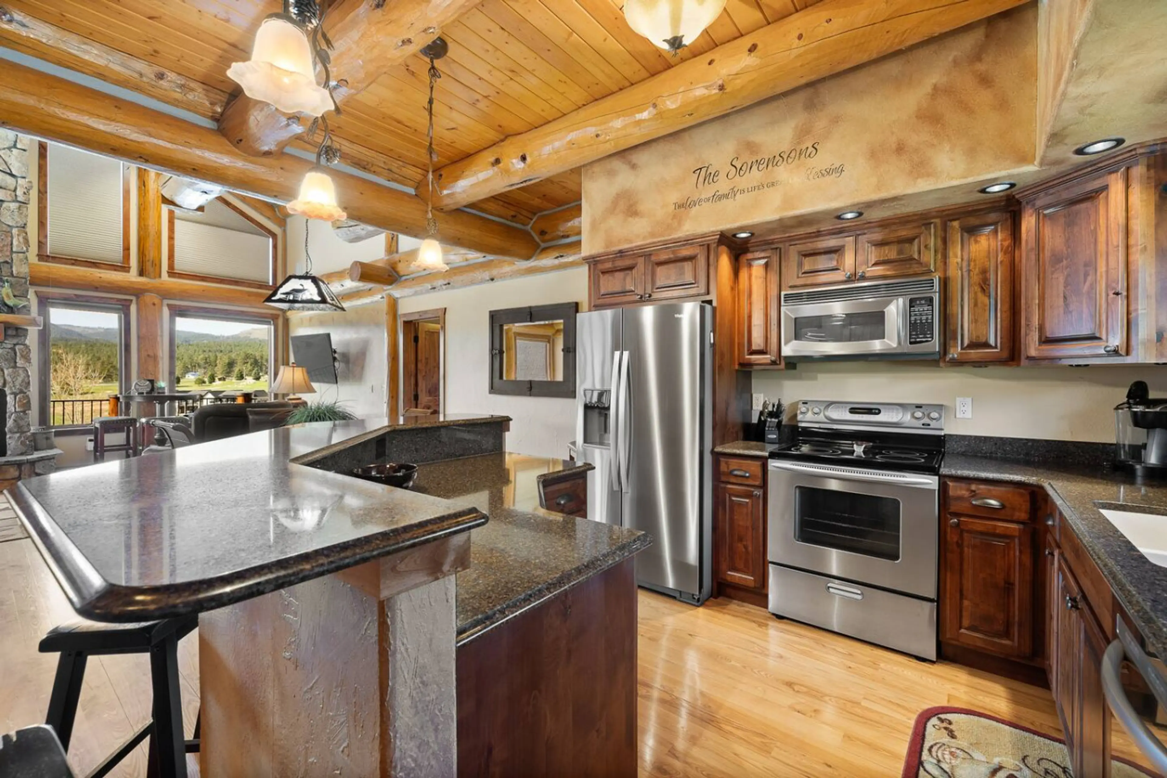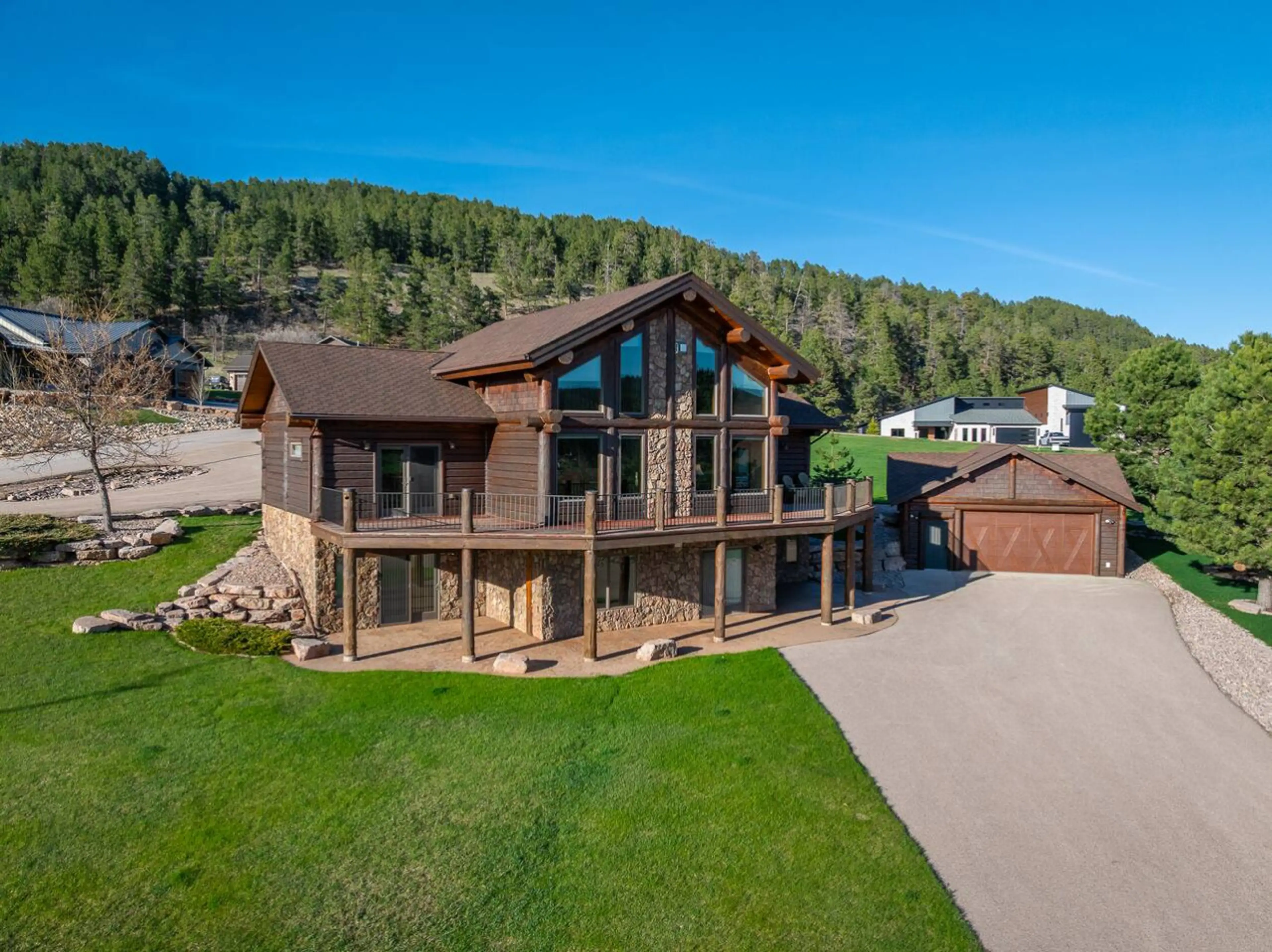 Luxury log cabin retreat in the Apple Springs subdivision of Sturgis. This 5-bedroom, 3.5-bath home features soaring vaulted ceilings, two stone fireplaces, and windows that bring the Black Hills inside. Whether you’re relaxing in the loft, hosting dinner in the open-concept living space, or unwindi...